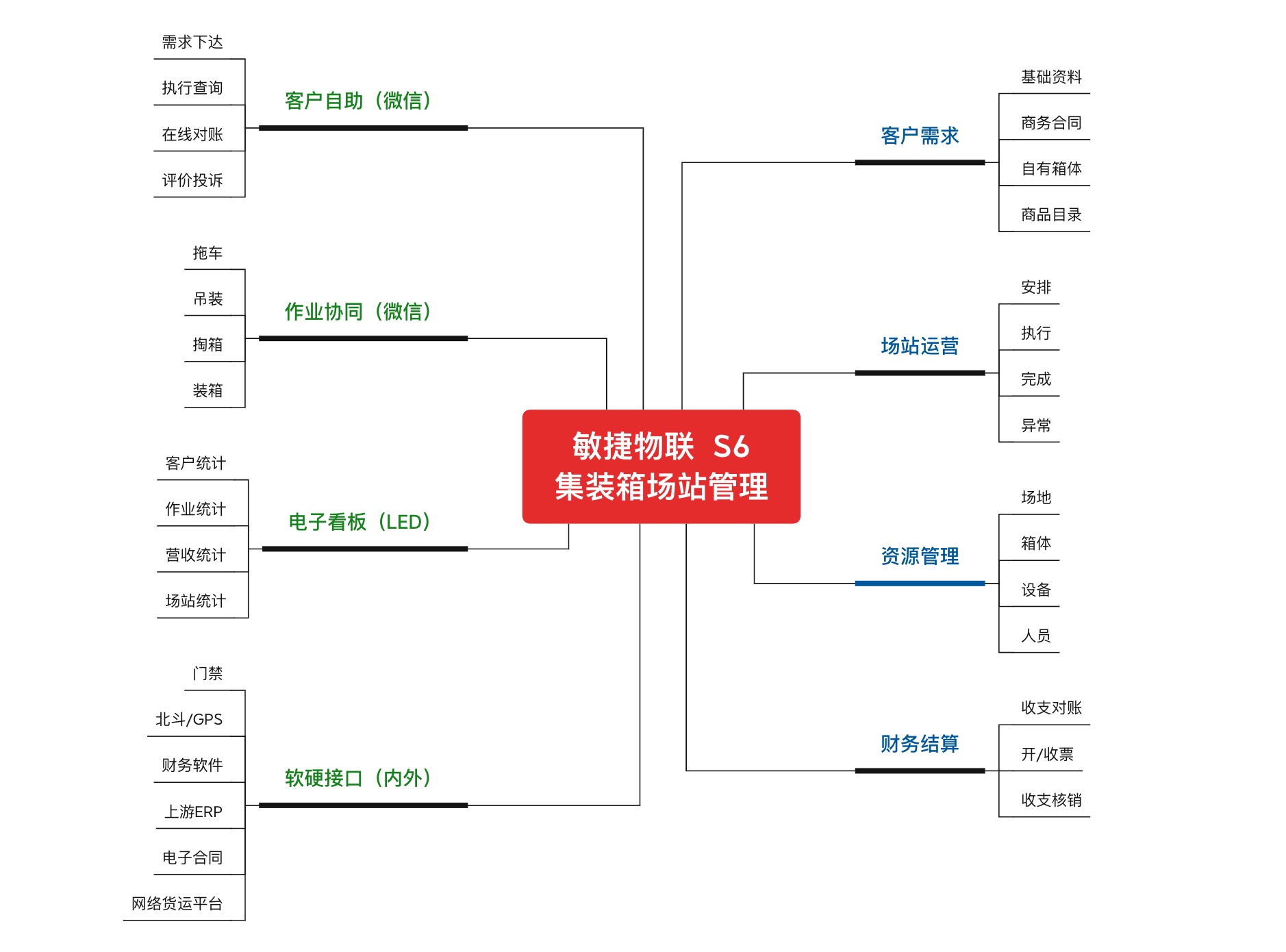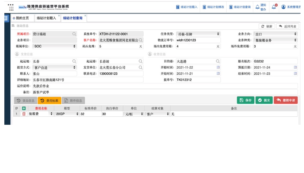 面向集装箱堆场,接受进出场和作业指令,安排拖车和作业车辆及人员,实时记录作业情况,自动完成财务收支结算,车辆和机具日常管理,对外链接客户,实现箱/货/场的全程管控,在线服务。