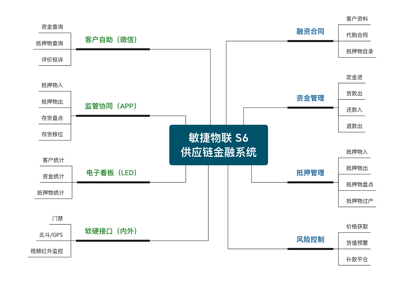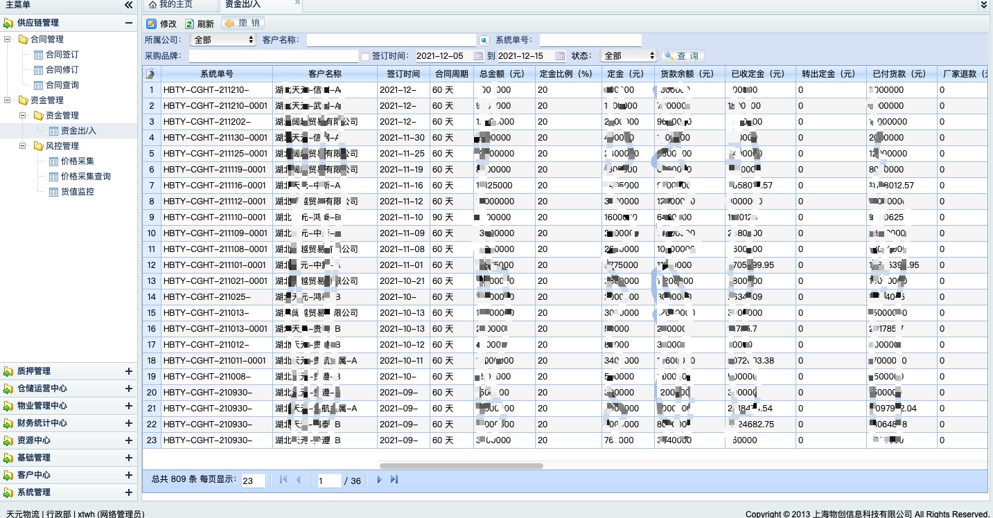 面向供应链金融的资金方、监管方,完成代购、质押等融资业务,包含合同管理、资金进出管理、质押物动态进出仓监管以及风险控制机制,也提供微信端的资金和抵押物变动通知和查询。